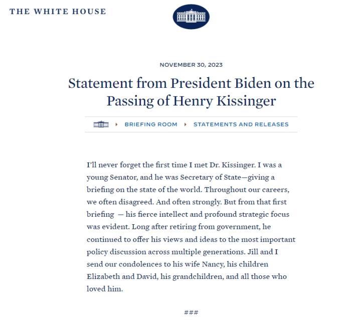 中新網12月1日電 綜合報道,美國前國務卿基辛格于當地時間11月29日去世,享年100歲。當地時間11月30日,美國白宮網站發布了拜登的哀悼聲明。