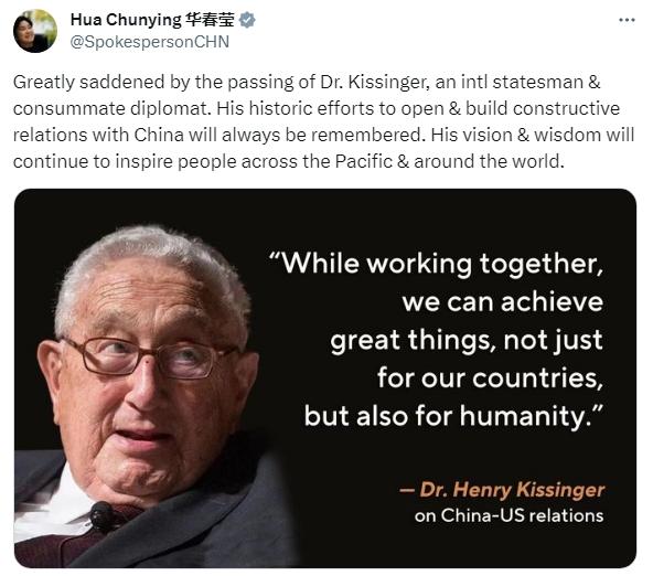 華春瑩:基辛格的遠見和智慧將繼續激勵全世界的人們