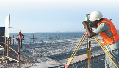 坦桑尼亞馬古富力大橋由中國土木工程集團有限公司和中鐵十五局聯合承建,連接坦桑尼亞蓋塔省和姆萬扎省,是坦桑尼亞重要的內陸國際通道。大橋建成后將極大改善當地交通狀況,帶動坦桑尼亞與周邊國家的互聯互通,促進區域經濟社會發展。圖為該項目外籍工程師正在使用全站儀進行室外測控。