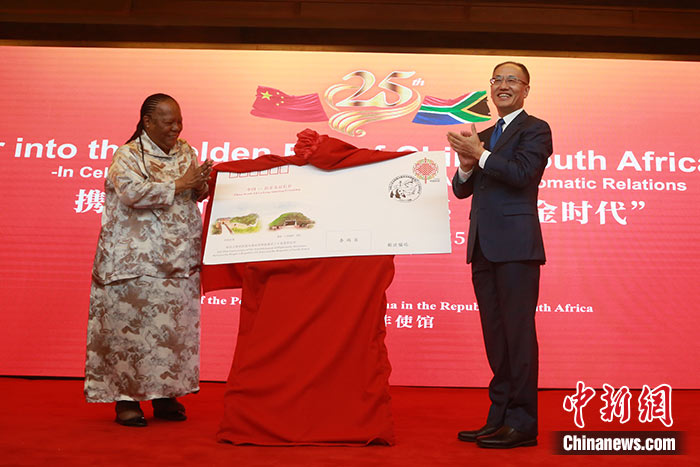 當地時間12月12日,中國駐南非大使館隆重舉行慶祝中國和南非建交25周年招待會。圖為中國駐南非大使陳曉東同南非外長潘多爾為中南建交25周年紀念封揭幕。 中新社記者 王曦 攝