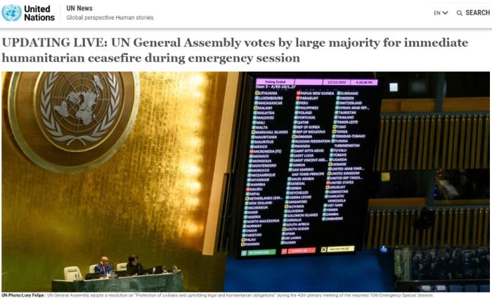 中新網12月13日電 據聯合國新聞網消息,當地時間12日,聯合國大會針對巴以沖突召開緊急會議,并討論了一項呼吁加沙立即實現人道主義停火的決議。