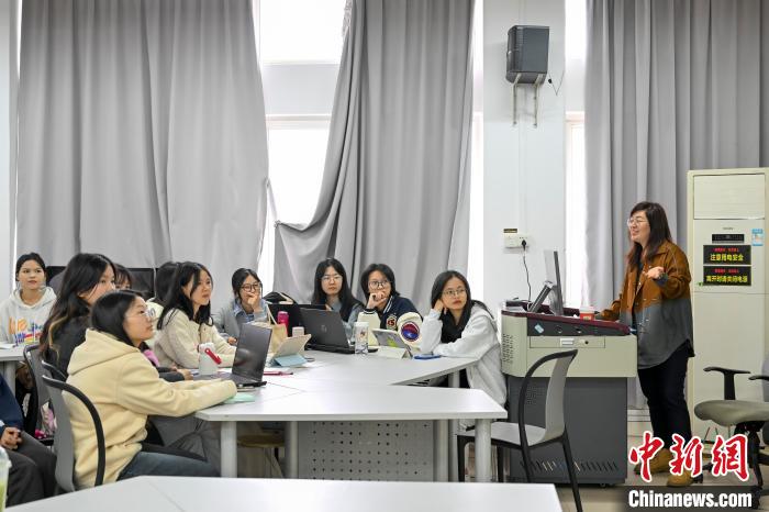 近日,謝雅卉(左三)與同學(xué)們在課堂上討論廣告設(shè)計(jì)內(nèi)容。中新社記者 陳驥旻 攝