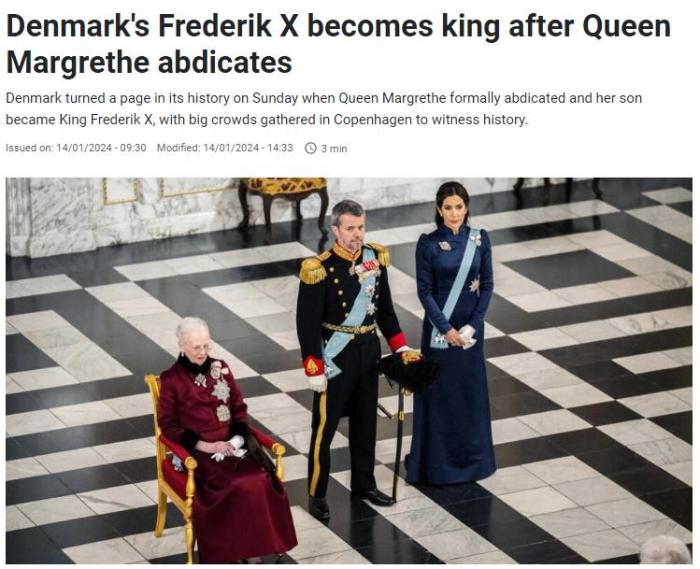當天早些時候,丹麥女王瑪格麗特二世宣布退位。瑪格麗特二世出生于1940年,于1972年繼位。她于2023年12月31日發表新年致辭時宣布了退位消息。
