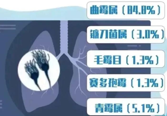 一項發表在《協和醫學雜志》上的我國霉菌感染流行病學分析的多中心回顧性研究顯示,以曲霉屬引起的感染占比最高為84.8%,其次是鐮刀菌屬、毛霉目和賽多孢霉等霉菌造成的感染,在霉菌引起的常見感染性疾病中以下呼吸道、耳部、眼部和皮膚感染較多見。