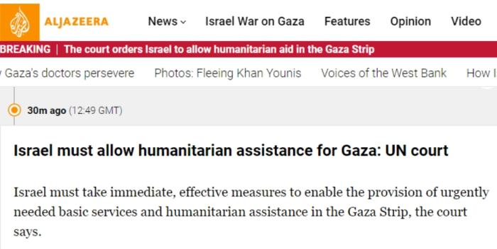 卡塔爾半島電視臺稱,國際法院責(zé)成以色列采取更多措施保護(hù)巴勒斯坦人,但沒有命令其結(jié)束在加沙地帶的軍事行動。此外,國際法院要求以色列在一個月內(nèi)就其已采取的行動向國際法院提交報(bào)告。