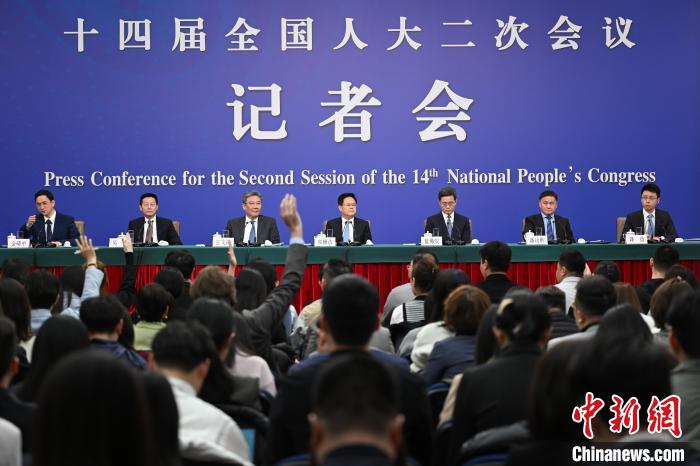 3月6日,十四屆全國人大二次會議在北京舉行記者會,國家發展和改革委員會主任鄭柵潔、財政部部長藍佛安、商務部部長王文濤、中國人民銀行行長潘功勝、中國證券監督管理委員會主席吳清就發展改革、財政預算、商務、金融證券等相關問題回答中外記者提問。圖為記者舉手提問。 中新社記者 何蓬磊 攝