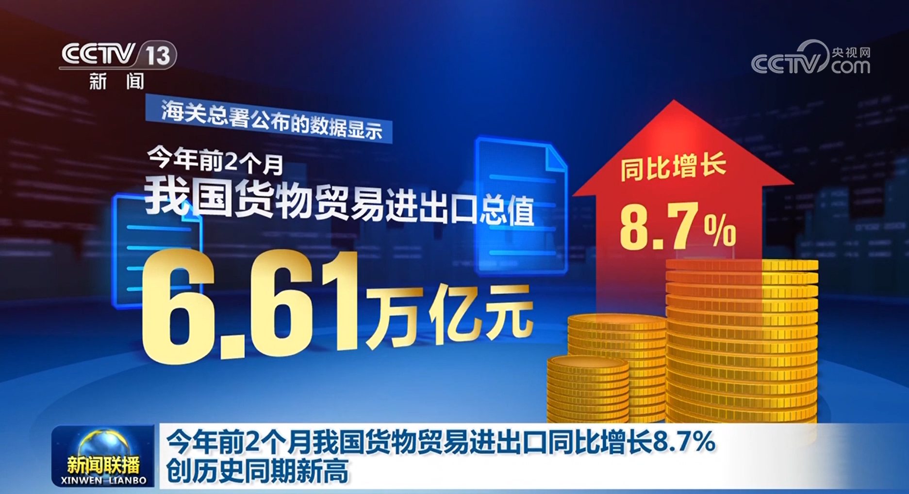 央視網消息(新聞聯播):記者今天(3月7日)從海關總署獲悉,今年前2個月,我國貨物貿易進出口規模創歷史同期新高,外貿實現良好開局。