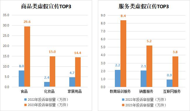 消費者在購物時會接觸到各種各樣的宣傳信息,但海量的宣傳信息并非都是真實可信的,一些商家以夸大其詞、隱瞞真相等手段,誘使消費者做出錯誤的消費選擇。2023年,全國12315平臺接收虛假宣傳投訴舉報144.3萬件,同比增長1.7倍。從商品服務類別來看,商品類別中虛假宣傳投訴舉報較多的有食品(29.6萬件)、化妝品(15萬件)、家居用品(14.4萬件);服務類別中虛假宣傳投訴舉報較多的有教育培訓服務(8.4萬件)、銷售服務(5.2萬件)、互聯網服務(3.8萬件)。消費者反映的問題主要集中在商家虛構產品效果、夸大產品優勢,通過“好評返現”提高虛假聲譽,誤導消費者購買等。