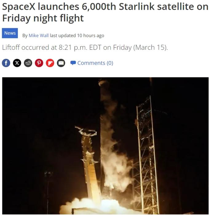 報道稱,自2019年第一顆“星鏈”衛星發射升空后,此次發射將部署在太空的“星鏈”衛星總數量增加到6000多顆。