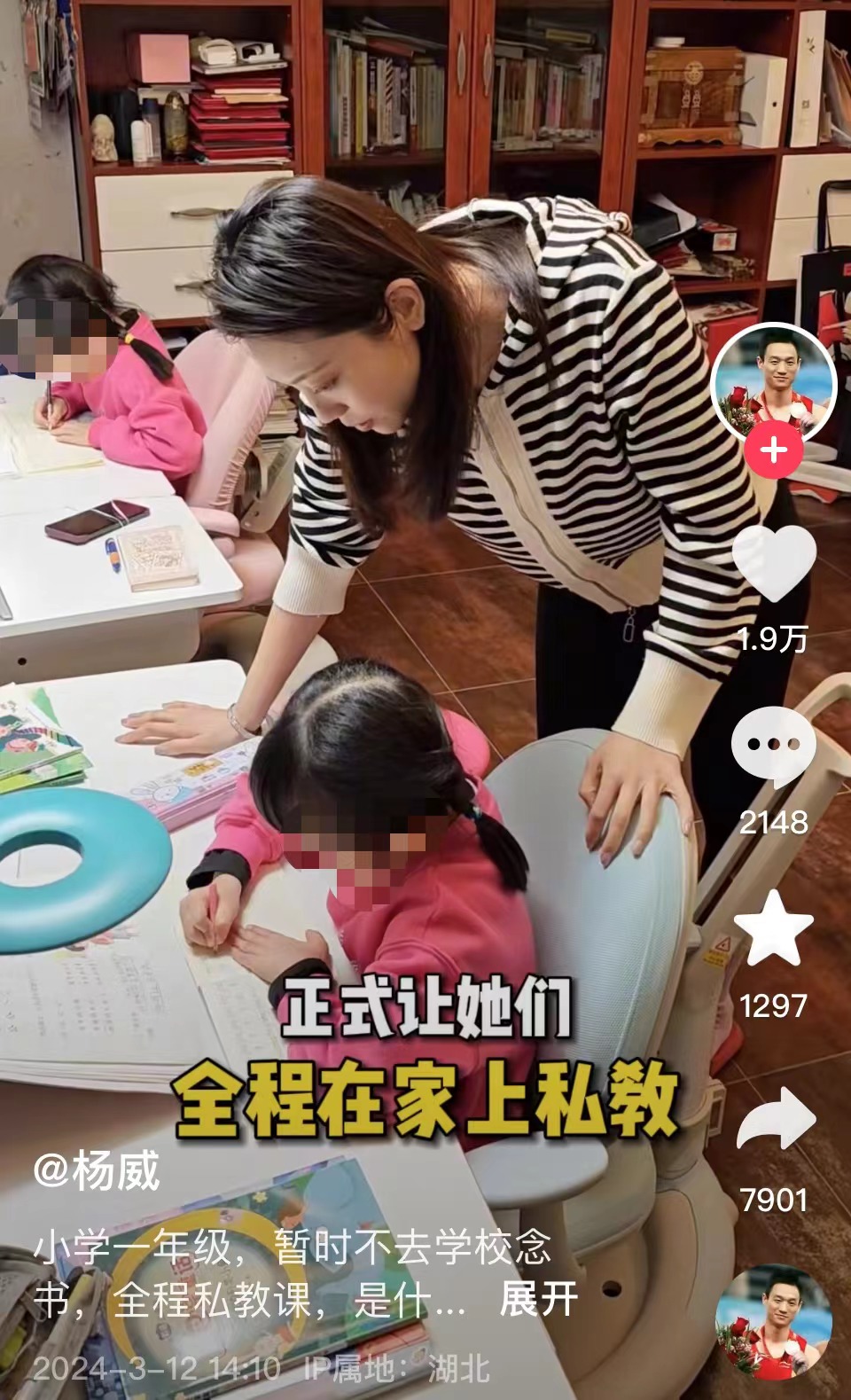 近日,體操奧運冠軍楊威在社交平臺發布視頻稱,由于去年兩個女兒連生好幾場病后,他跟妻子楊云做了個大膽嘗試,讓上一年級的兩個女兒暫時不去學校念書,全程在家上私教。