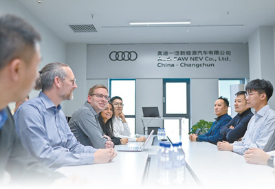 近年來,許多外國專家感受到發展機遇,來到中國安居樂業。圖為德國工程師薩沙(左三)與妻子約翰娜(左四)在位于吉林長春的奧迪一汽新能源汽車有限公司會議室開會。