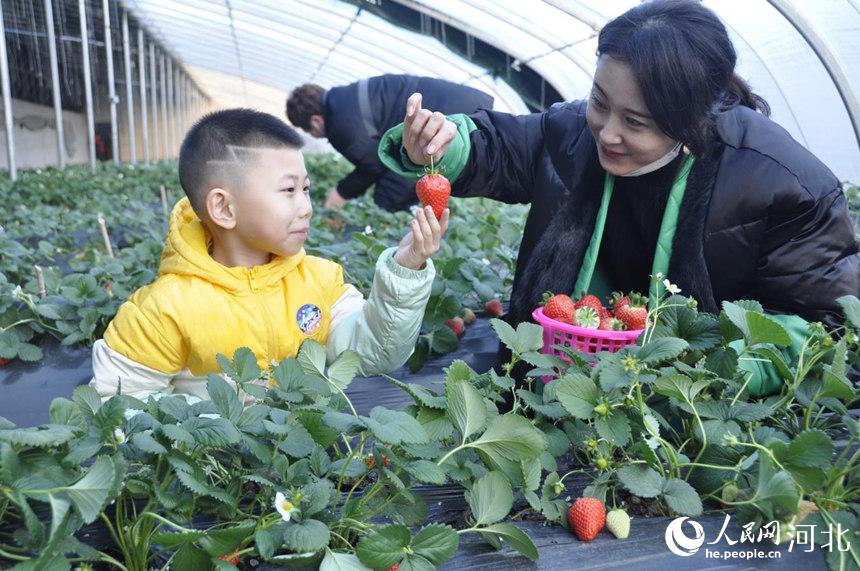 在溫暖如春的大棚內可以看到,新鮮的草莓掛滿田壟,吸引著遷安市域內眾多游客競相采摘。“這里的草莓個頭大,顏色艷,嘗起來格外香甜。我們邊摘邊吃,既能吃到新鮮的草莓,又能感受農村的生活氛圍。”專門從楊店子街道前來采摘草莓的王女士忍不住夸贊。