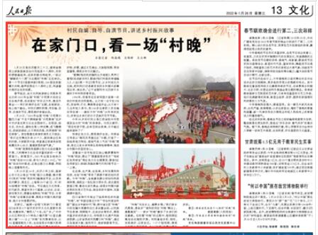 1月25日至26日,農歷小年之際,國家公共文化云推出“村晚”接力云展播,集中展示《我的“村晚”我的年》融媒體節目,以及來自內蒙古、黑龍江、上海等20個省(區、市)的30場精彩“村晚”活動。節目通過文化傳承、時代新風、展望未來3個篇章,以訪談、互動、游戲等方式,展播各地特色“村晚”節目、分享“村晚”臺前幕后故事、展現鄉村振興美好畫卷、推介鄉村美景好物。