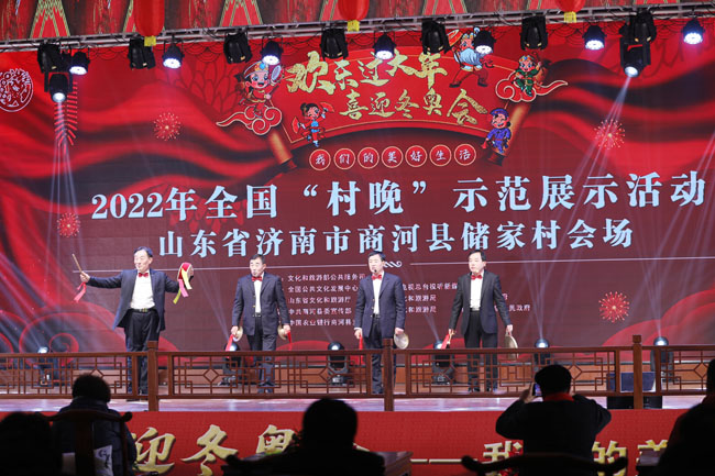 儲家村是山東省8個示范點之一、濟南市唯一的展示點。整場晚會圍繞“過大年”“迎冬奧”“美好生活”“百年成就”等主題內容進行編創,由非遺鼓子秧歌傳統民俗活動展演及文藝演出兩大活動內容構成。