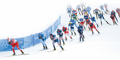 圖為2月19日,參賽選手在越野滑雪男子50公里集體出發(自由技術)比賽中。受天氣影響,賽程縮短為30公里。