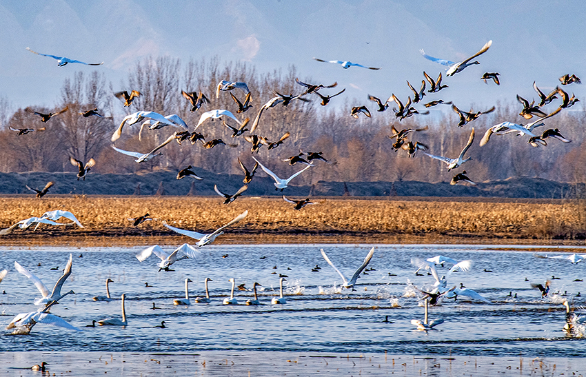 隨著天氣漸暖,棲息在山西省運(yùn)城市萬榮縣黃河濕地越冬的白天鵝十分活躍,它們在濕地或飛翔、或覓食、或嬉戲,為一年一度的遷徙做準(zhǔn)備,吸引眾多游客前來觀賞。