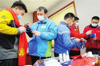 圖為快遞小哥代表領(lǐng)取“暖心包裹”。 記者 吳迪 攝