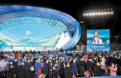 3月6日晚,北京冬殘奧會張家口賽區首場獎牌頒發儀式在張家口頒獎廣場舉行。 河北日報記者 賈 恒攝