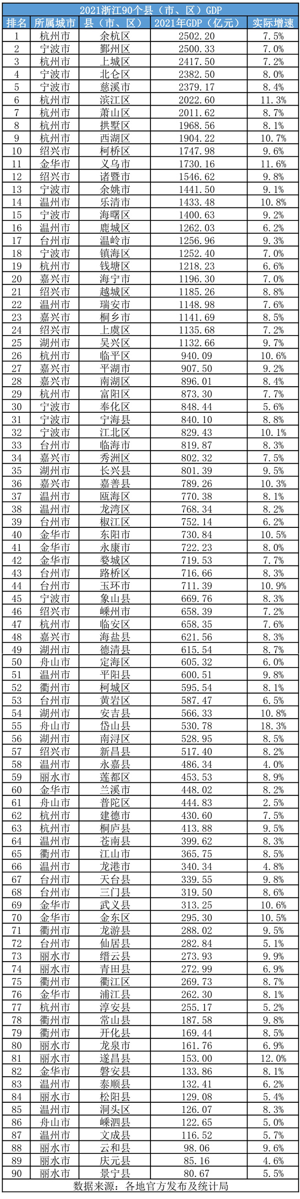 2021年浙江省各縣(市、區)GDP總量排名。制圖:葉賓得