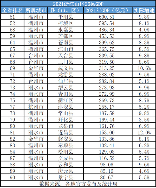 2021年浙江山區26縣GDP總量排名。制圖:葉賓得