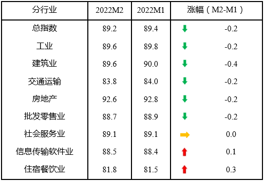 企業(yè)效益有待提升。由于國內(nèi)穩(wěn)增長預期上升及俄烏沖突,國際能源、原材料等大宗商品價格反彈,但消費恢復偏弱,上下游行業(yè)利潤分化加劇,小微企業(yè)利潤承壓。2月效益指數(shù)為74.4,比上月下降0.5點,仍為8個分項指數(shù)中的最低值,處于歷史較低位。所調(diào)查的8個行業(yè)中,5個行業(yè)效益指數(shù)下降。