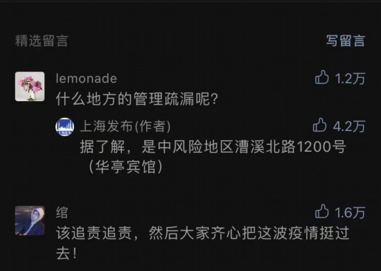 是什么地方的“疏漏”?“上海發布”在留言區直白回復網友:“據了解,是中風險地區漕溪北路1200號(華亭賓館)”。