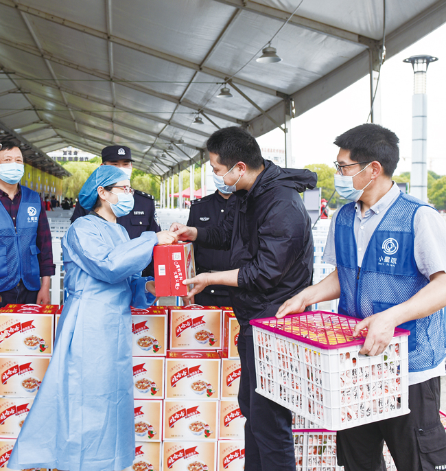3月17日,志愿者給金華市金東區方艙核酸采樣站抗疫一線醫護人員、公安民警,送去水果、八寶粥、草帽等價值5000余元的物資。金東區方艙核酸采樣站有120多名工作人員,24小時為市民進行免費核酸采樣。(李建林)