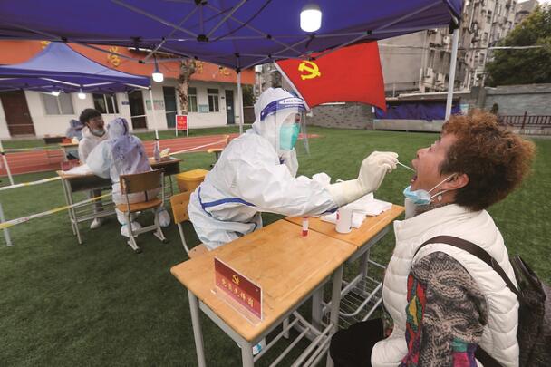 本周末,南京市抓緊開展規模性核酸檢測。圖為3月19日,在南京鼓樓區小市新村社區核酸檢測點,市民正接受核酸檢測取樣。 本報記者 陳儼 攝