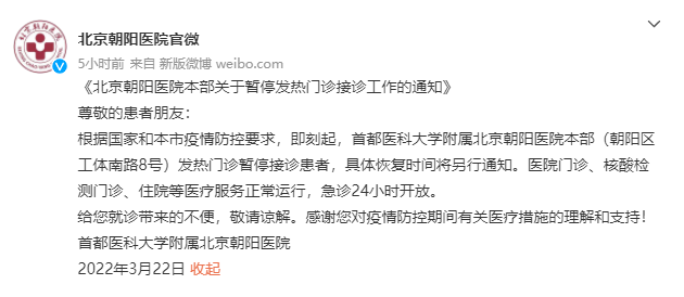 人民網北京3月22日電 據北京朝陽醫院官微消息,根據國家和北京市疫情防控要求,即刻起,首都醫科大學附屬北京朝陽醫院本部(朝陽區工體南路8號)發熱門診暫停接診患者,具體恢復時間將另行通知。醫院門診、核酸檢測門診、住院等醫療服務正常運行,急診24小時開放。