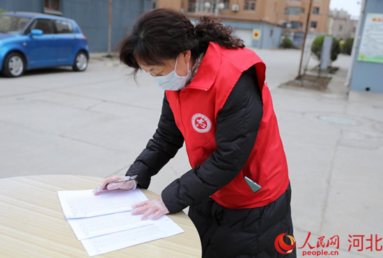 河間市的志愿者身穿紅馬甲在防控一線提供志愿服務。 李世文攝
