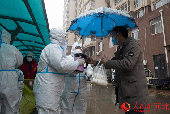 “辛苦了!喝點熱水吧!”滄州當地居民為雪天里堅守的抗疫白衣工作者送去暖心的熱水。 牛建才攝