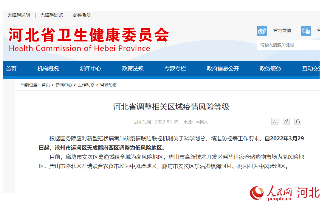 人民網石家莊3月29日電 據河北省衛健委發布的最新消息,根據國務院應對新型冠狀病毒肺炎疫情聯防聯控機制關于科學劃分、精準防控等工作要求,自2022年3月29日起,河北省將滄州市運河區天成郡府西區調整為低風險地區。