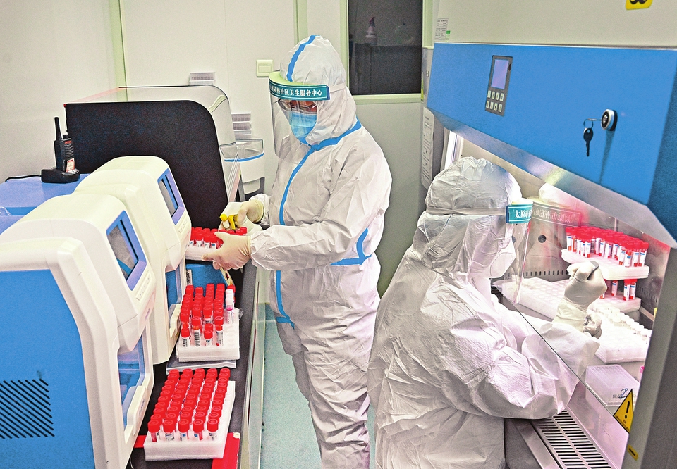 在太原市杏花嶺區壩陵橋社區衛生服務中心PCR室,醫務人員正在對采集樣本進行新型冠狀病毒核酸檢測。 記者劉通攝