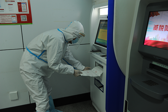 唐山高新區(qū)稅務(wù)局工作人員與企業(yè)財(cái)務(wù)人員進(jìn)行領(lǐng)票前的消毒和查驗(yàn)工作。 韓堯攝