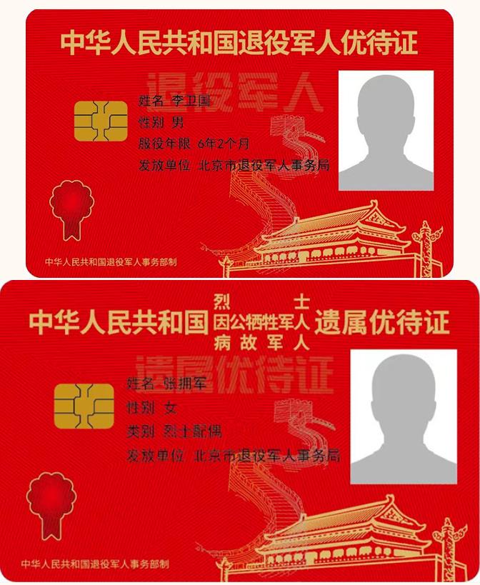 據介紹,優待證以紅色為基調,正面印有優待證種類名稱,持證人基本信息、相片等。背面印有制證銀行名稱、銀行卡號等信息。優待證分為“中華人民共和國退役軍人優待證”“中華人民共和國烈士、因公犧牲軍人、病故軍人遺屬優待證”兩種,分別面向符合條件的退役軍人和烈士遺屬、因公犧牲軍人遺屬、病故軍人遺屬等其他優撫對象免費發放,是持證人彰顯榮譽的載體、享受優待的憑證。