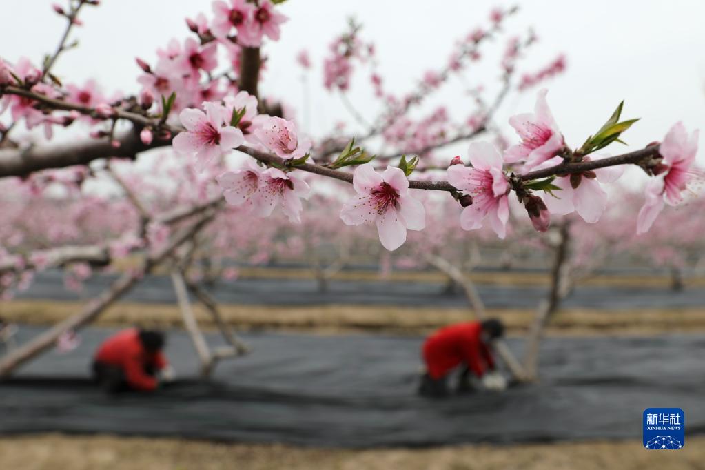 4月5日,在江蘇省淮安市洪澤區東雙溝鎮,農民在桃園里勞作。