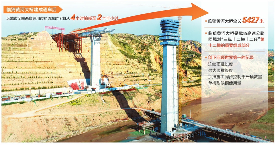 臨猗黃河大橋是連接晉陜最長的黃河公路大橋,全長5427米,主橋采用等高度連續鋼箱組合梁,從山西、陜西兩處頂推平臺對向頂推,這也創下連續頂推長度、最大頂推長度、頂推施工同步控制千斤頂數量以及單橋耐候鋼使用量四項世界第一的紀錄。