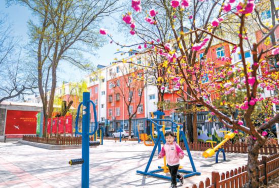 大興區興豐街道老小區黃村西里社區在居民的共同維護下,居住環境整潔舒適。圖為提升后的社區廣場上,小朋友正在樂享春光。本報記者 武亦彬攝