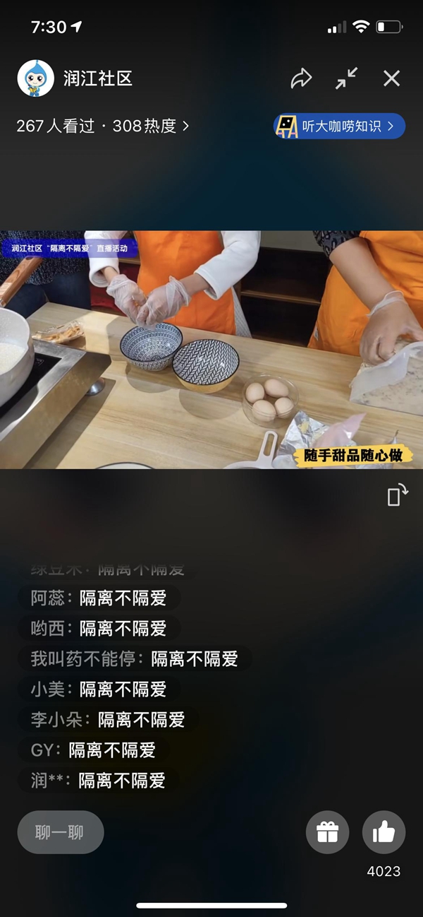 在這個特殊的“戰疫”時刻,潤江社區依舊在3月29日-4月3日6天時間里陸續推出了包括心理疏導課程、健身指導課程、烘焙分享、家庭收納、親子共讀和感悟分享在內的直播內容。截至目前,“小杜直播間”已經吸引了社區內近1500人次觀看,這些直播內容貼合了社區居民的需求,從各方面為居民緩解居家的焦慮、豐富居民的居家生活。