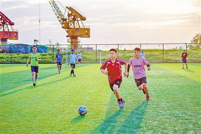 4月9日,在利用廢舊碼頭改造而成的安徽省銅陵市濱江生態(tài)體育公園,足球愛好者競逐綠茵,不遠處的碼頭吊臂高高矗立。近年來,各地注重盤活城市空閑土地,通過新建或改擴建體育公園、公共體育場館等,加大全民健身場地設(shè)施供給。