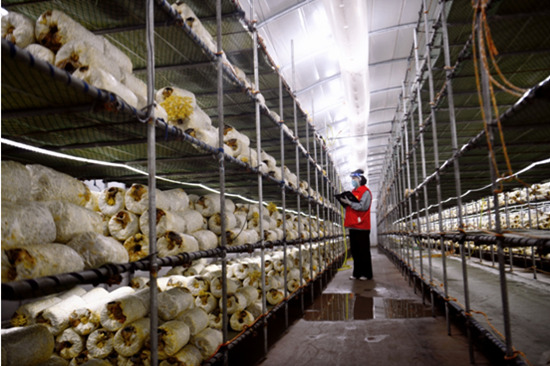邯鄲市廣平縣十里鋪鎮陳固村農事代辦志愿者走進陳固村菌菇大棚,查看菌菇長勢。武小凱攝