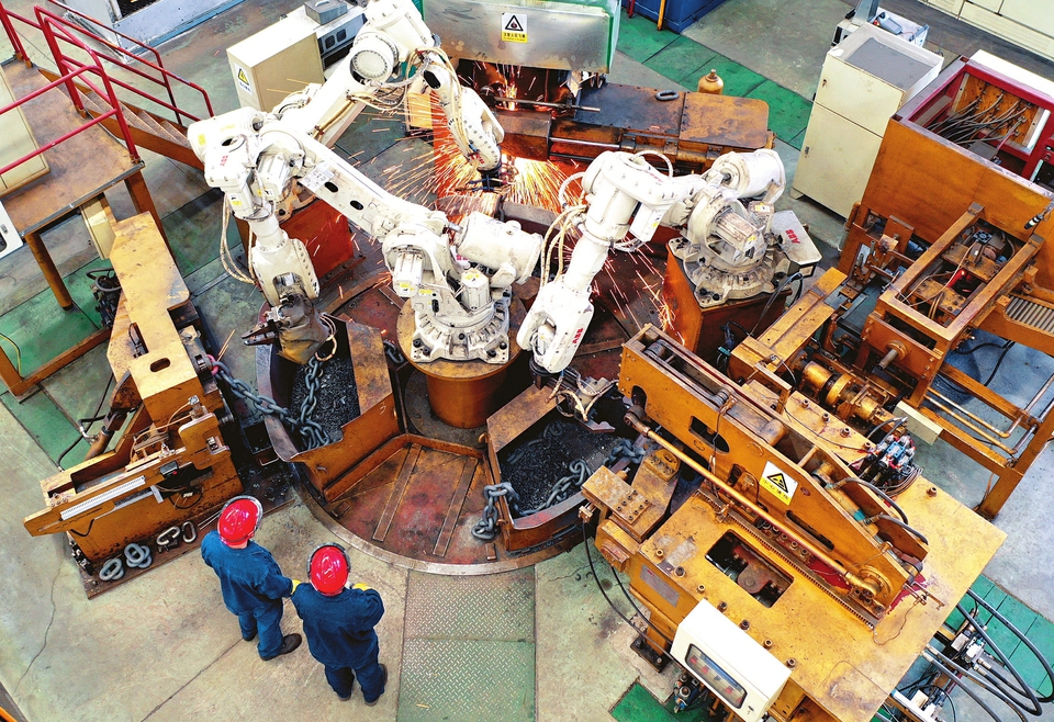 5月5日,在晉能控股裝備制造集團華越華茂公司生產(chǎn)車間,國內(nèi)首套國產(chǎn)化礦用高強度圓環(huán)鏈全自動制鏈機組正在作業(yè)中。近年來,該公司不斷提升裝備能力,其生產(chǎn)的礦用高強度圓環(huán)鏈、緊湊鏈及各類工業(yè)用鏈條,工藝達到國內(nèi)領先水平。(記者劉通攝)