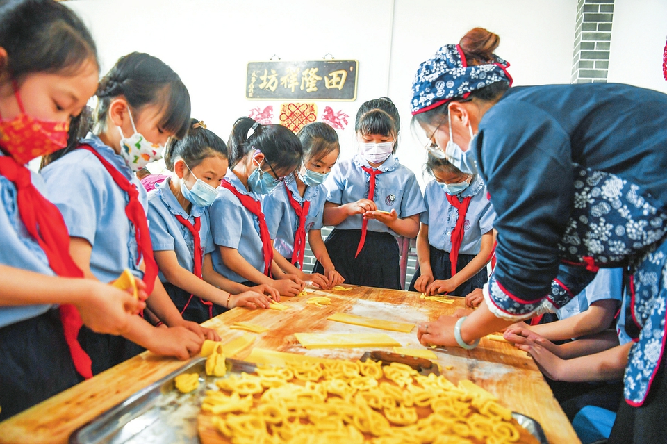 5月3日,平遙縣實驗小學三年級463班的學生在平遙縣田隆祥油花花非遺傳學基地體驗油花花、月餅等傳統食品的制作過程。“五一”期間,平遙縣實驗小學在做好疫情防控的同時,組織學生就地開展多種形式的非遺文化項目傳學活動,讓孩子們近距離感受非遺文化的魅力,豐富假期生活。(梁生仁攝)