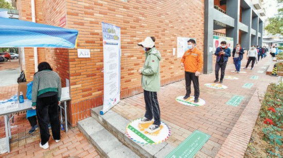 本報訊(記者 李瑤)昨天,東城區東四街道在轄區內5個常態化核酸檢測點推出新式“兩米線”,通過充滿童趣的“呼啦圈”地貼,引導居民有序排隊,保持安全距離。“呼啦圈”直徑大約80厘米,中間黃色腳印圖案十分醒目,旁邊還印有疫情防控科普貼,居民站在圈內有序排隊等待核酸檢測。“‘不僅富有童趣,使排隊等候不再那么乏味,還嚴格規定了排隊距離,保證大家的安全。”居民點贊說。本報記者 鄧偉攝