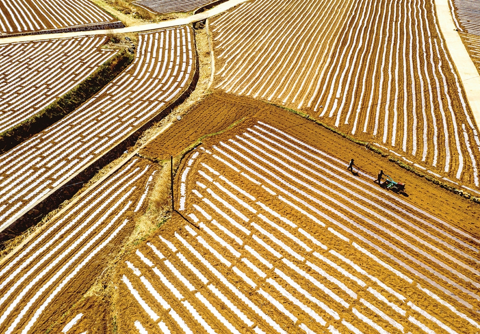 5月15日,晉中市左權縣下莊村鋪滿地膜的農田在陽光照射下,構成一幅錦繡太行的詩畫田園景致。近年來,左權縣積極落實糧食直補,地膜、農機財政補貼的政策,極大地調動了農民種糧的積極性,糧食連續獲得豐收。同時,通過農旅融合,詩畫般的田園風光吸引了不少游客,助推農民增收。(邢蘭富)