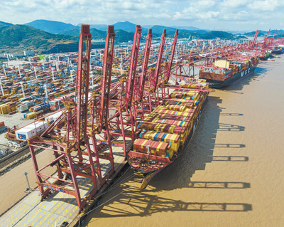 浙江寧波舟山港穿山港區集裝箱碼頭作業場景。