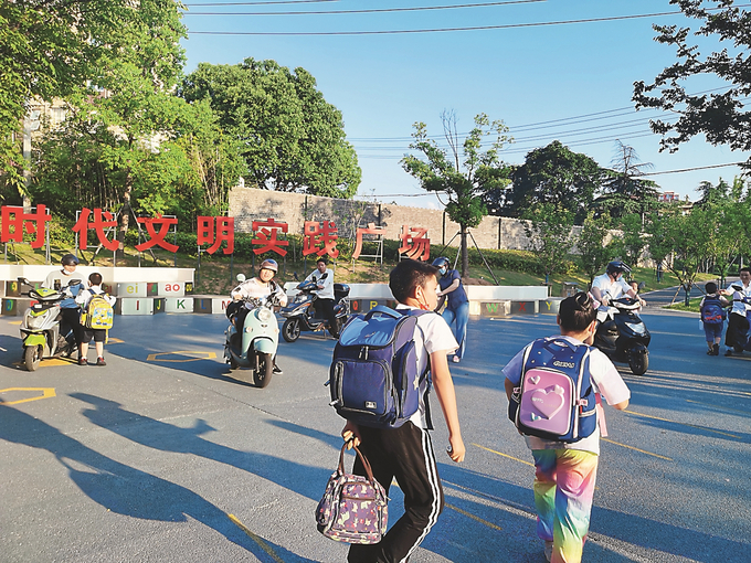 南京市棲霞區實驗小學西門前的口袋公園廣場上,孩子們歡笑著跑向父母。 劉玉琴 攝