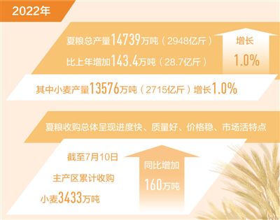 國家統計局7月14日發布數據顯示:2022年全國夏糧總產量14739萬噸(2948億斤),比上年增加143.4萬噸(28.7億斤),增長1.0%。其中,小麥產量13576萬噸(2715億斤),增長1.0%。
