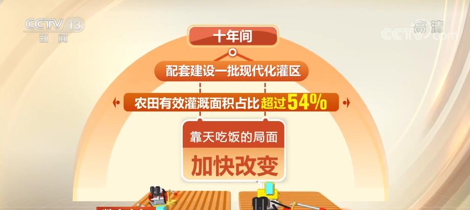 十年間,農業基礎設施明顯改善,累計建成9億畝高標準農田,配套建設一批現代化灌區,農田有效灌溉面積占比超過54%,靠天吃飯的局面加快改變。