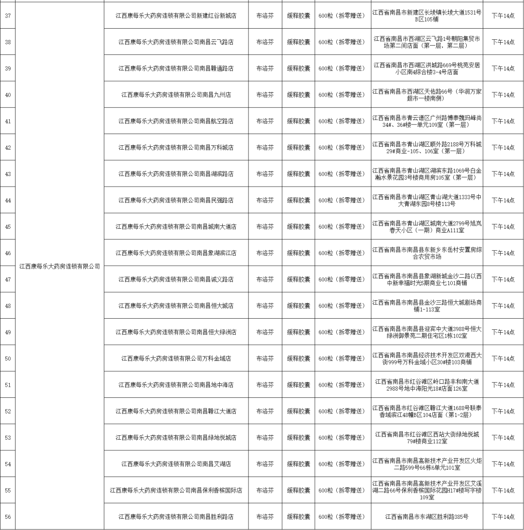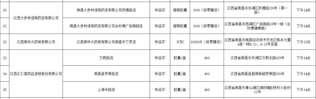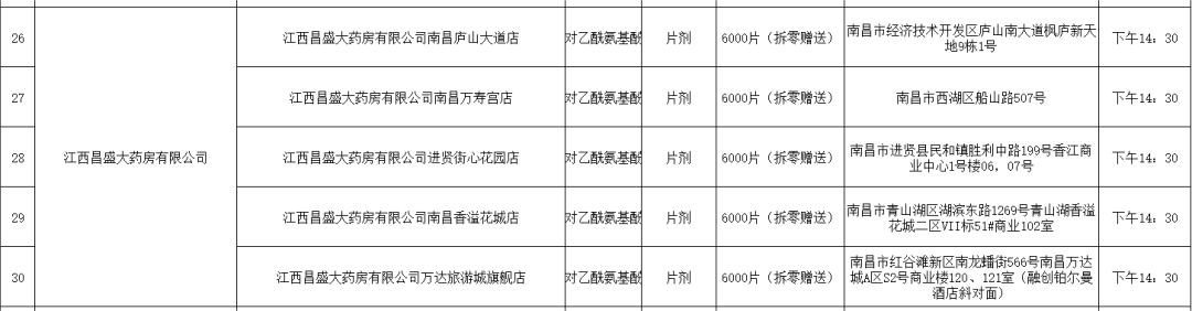 21日,南昌市市場監督管理局公布退熱藥品投放名單(第二批),本批次名單共公布7家藥品零售企業共56家藥店的退熱藥品投放信息,分別是:江西黃慶仁棧華氏大藥房有限公司、江西大參林連鎖藥店有限公司、江西南華大藥房有限公司、江西匯仁堂藥品連鎖股份有限公司、江西昌盛大藥房有限公司、江西益豐大藥房連鎖有限公司、江西康每樂大藥房連鎖有限公司。